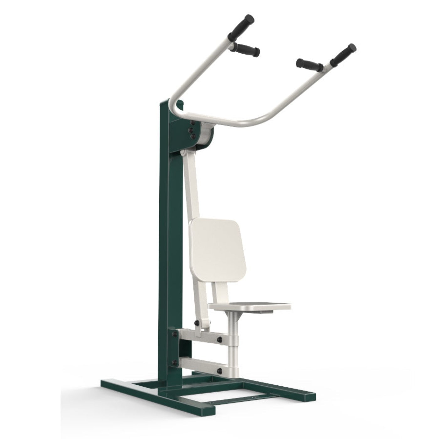 A: It is a strength training machine designed for seated lat pull exercises, helping to target and strengthen the back, shoulders, and arms.