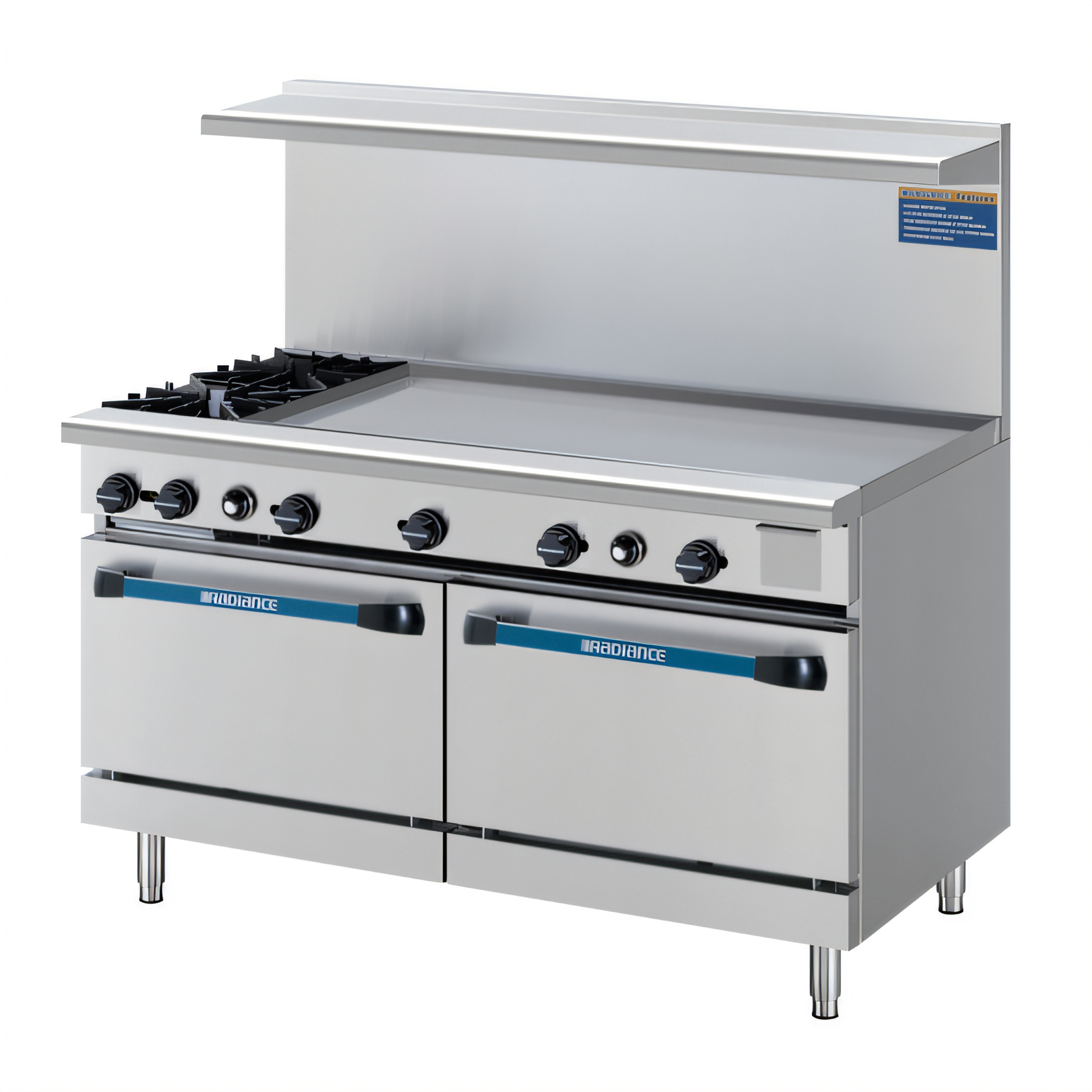 Bring uncompromising power, versatility, and durability to the cookline with the Turbo Air Radiance combination range. Two 32,000 BTU open burners handle high-heat sautéing and searing, while the expansive 48" thermostat-controlled griddle dominates the left side for breakfast, burgers, or bulk production. Dual standard ovens below round out a true all-in-one solution designed to keep up with the busiest kitchens.
