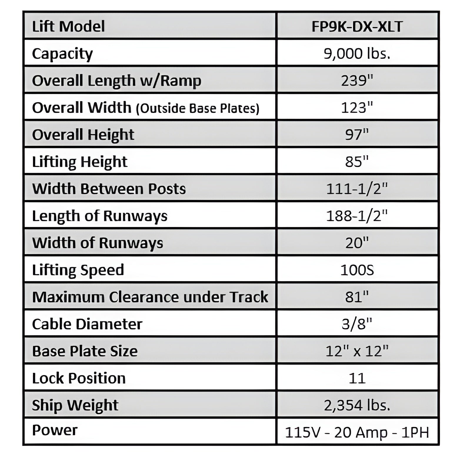 A: The FP9K-DX-XLT can lift up to 9,000 lbs, making it ideal for heavy-duty vehicles, trucks, and SUVs.