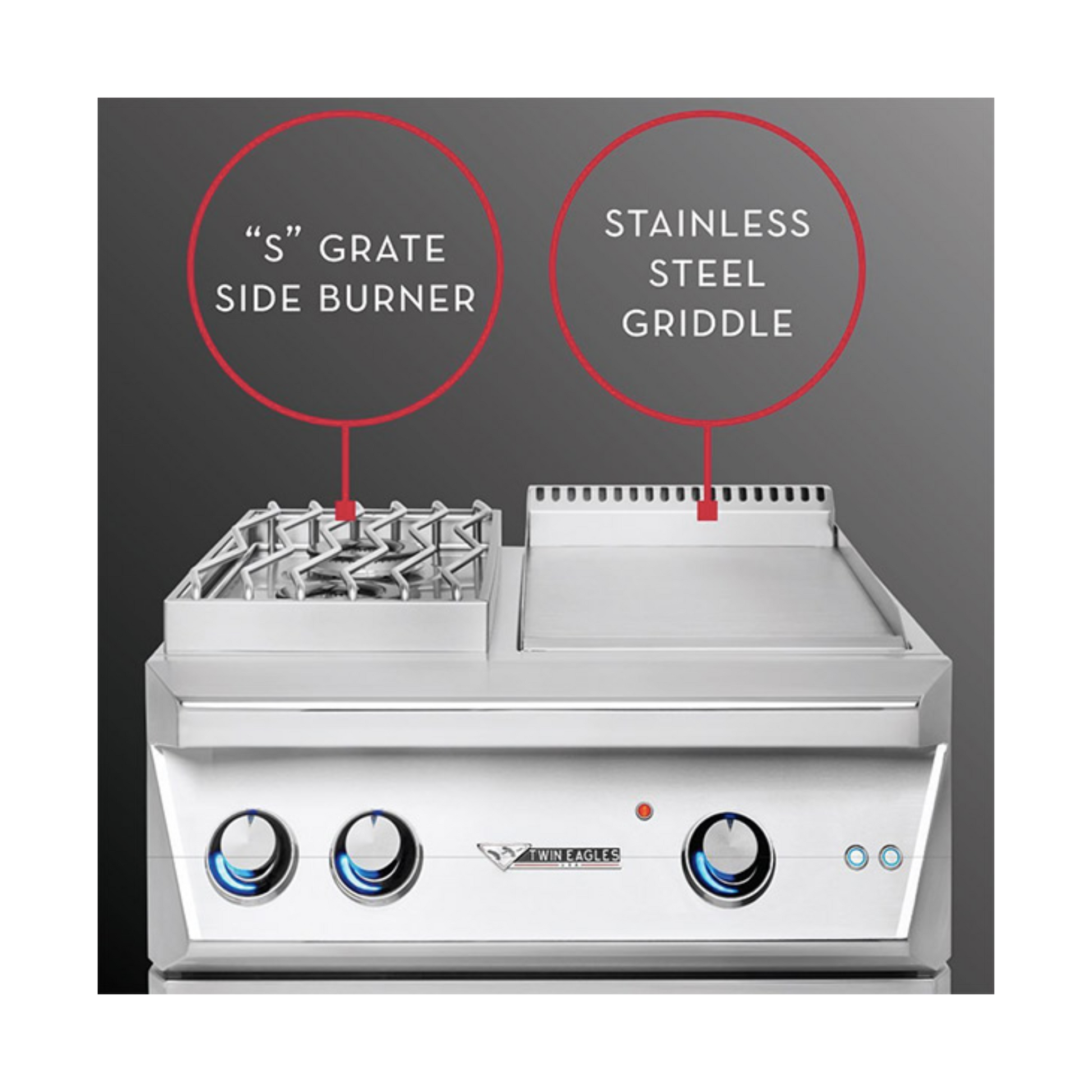 Twin Eagles Dine & Breakfast Club is the perfect companion to your grill and lets you entertain in your outdoor kitchen morning to evening. This combined side burner and griddle offers the best of both worlds and gives you the freedom to prepare dishes not typically cooked outside such as pancakes, bacon, omelets, fajitas, and more. This unit features a 20,000 BTU stainless steel griddle burner and two (2) 17,500 BTU dual-ring sealed burners on the side burner side. The griddle features solid 1/4-inch stainless steel cooking surface that provides high heat transfer and durability and a thermostat control knob with a heat on indicator light. The griddle has a removable grease trough located in the front of the griddle plate for easy clean up. The side burner control knobs have the Exclusive Control Illumination matching the Twin Eagles product line; they have highly visible graduated indigo blue line and a indicator notch that illuminates to give a precise control setting. Matching stainless steel covers are included to protect the burners and the griddle when not in use. Twin Eagles products are designed and manufactured in the USA with pride.Griddle has stainless steel, solid cooking griddle surface