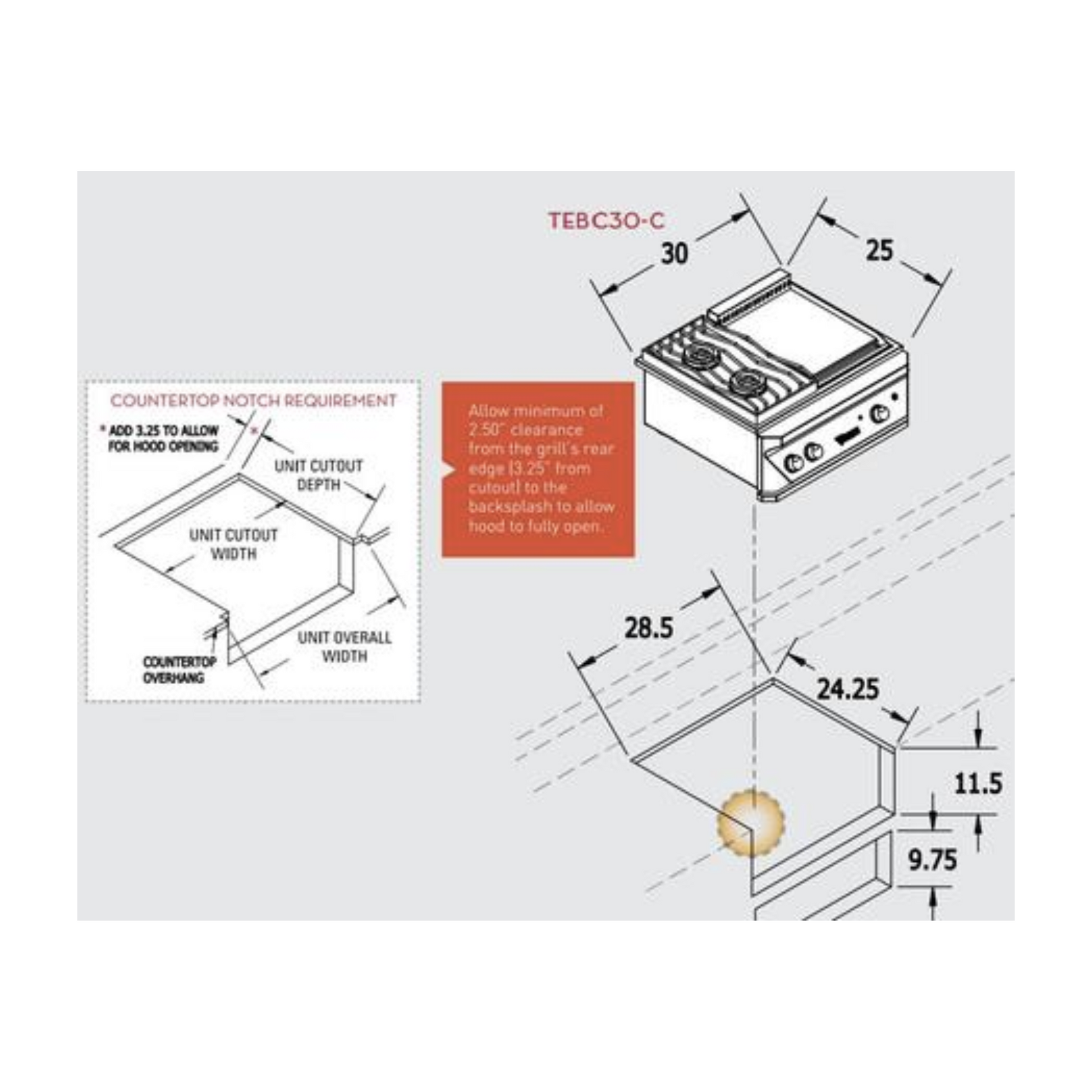 A: The required cutout dimensions are 28.5 inches in width, 11.5 inches in height, and 24.25 inches in depth.