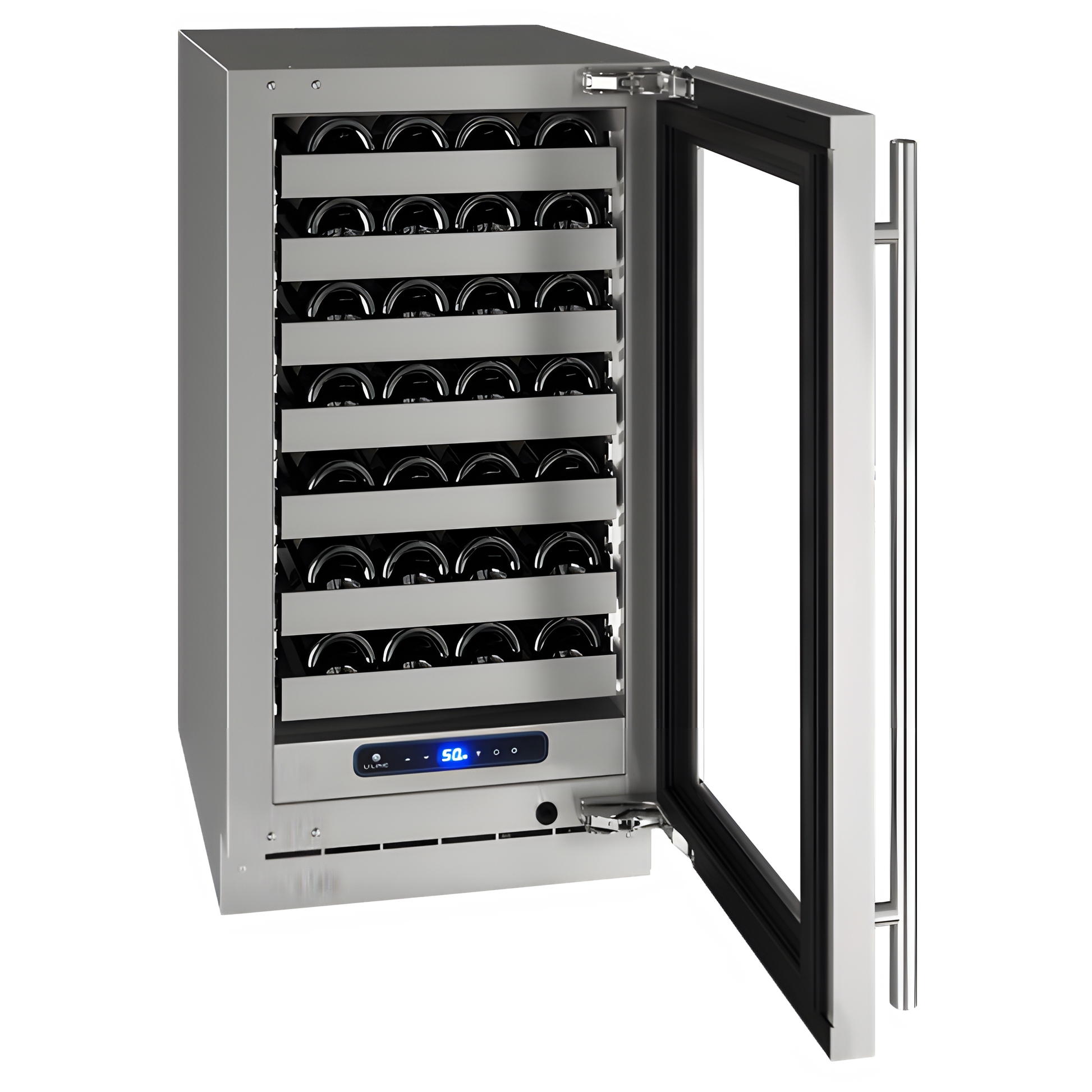 Our 18" 5 Class Wine Refrigerator is a wine lover’s dream, featuring stainless steel inside and out, convection cooling for quick and consistent temperatures, and a state-of-the-art variable speed compressor. This robust and refined model offers an industry-exclusive full-depth lower interior for maximum storage space, adjustable blue and white LED lighting, and U-Adjust™ 19 position adjustment for full extension wine racks. It can be built-in or used freestanding and is available with stainless steel or integrated door finishes that accept a custom door panel to match your surrounding cabinetry.