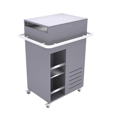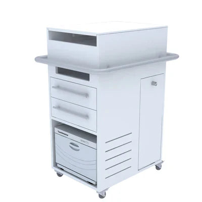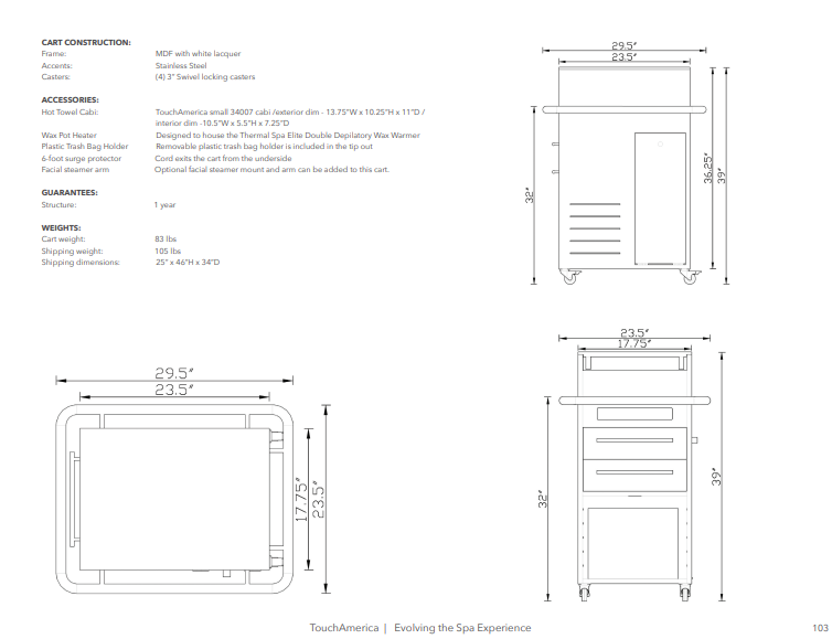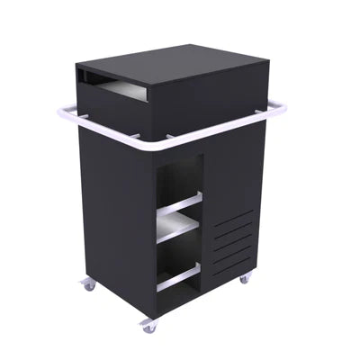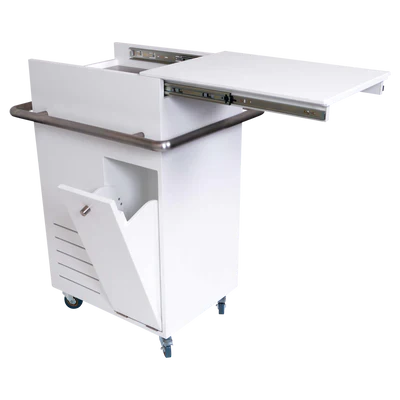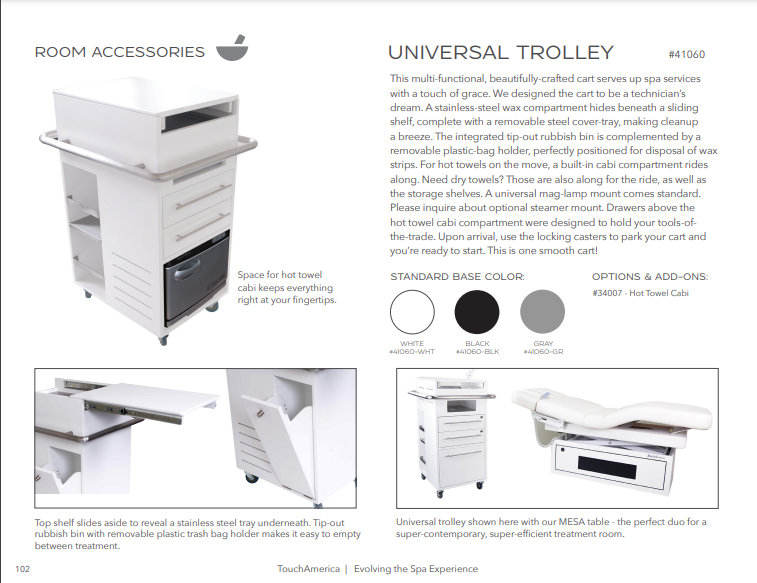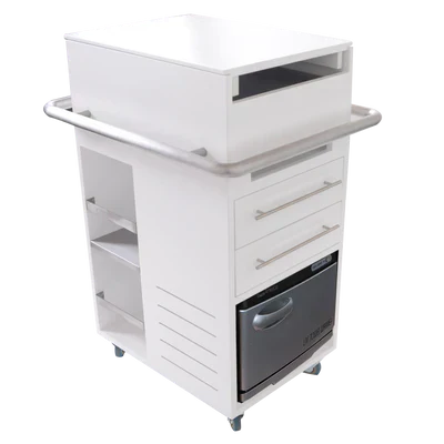 This multi-functional, beautifully-crafted cart serves up spa services with a touch of grace. We designed the cart to be a technician’s dream. A stainless-steel wax compartment hides beneath a sliding shelf, complete with a removable steel cover-tray, making cleanup a breeze. The integrated tip-out rubbish bin is complemented by a removable plastic-bag holder, perfectly positioned for disposal of wax strips. For hot towels on the move, a built-in cabinet compartment rides along. Need dry towels? Those are also along for the ride, as well as the storage shelves. A universal mag-lamp mount comes standard. Please inquire about optional steamer mount. Drawers above the hot towel cabi compartment were designed to hold your tools-of-the-trade. Upon arrival, use the locking casters to park your cart and you’re ready to start. This is one smooth cart!
