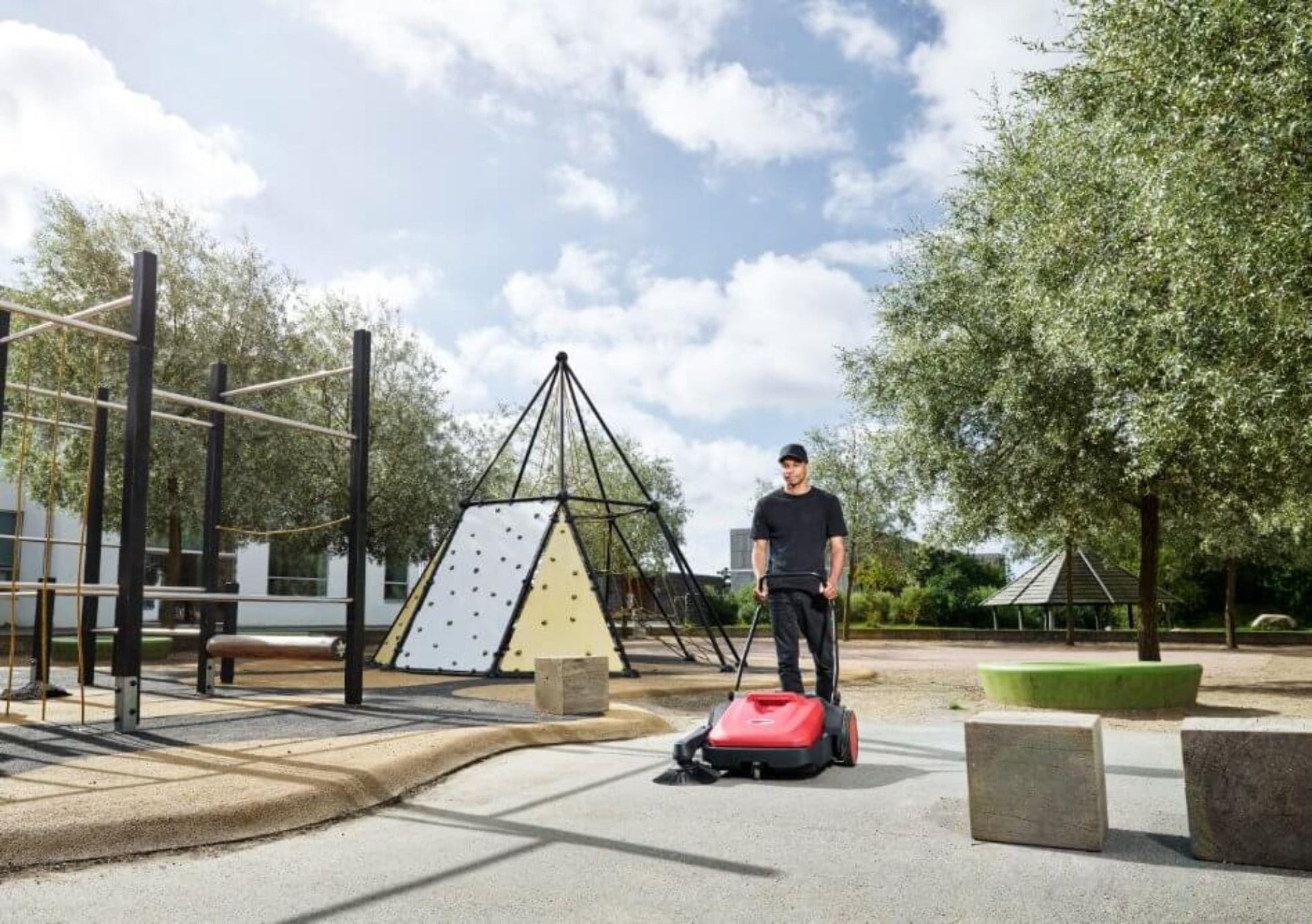 A: No, it is a fully manual sweeper, requiring no electricity or batteries, making it cost-effective and maintenance-free.
