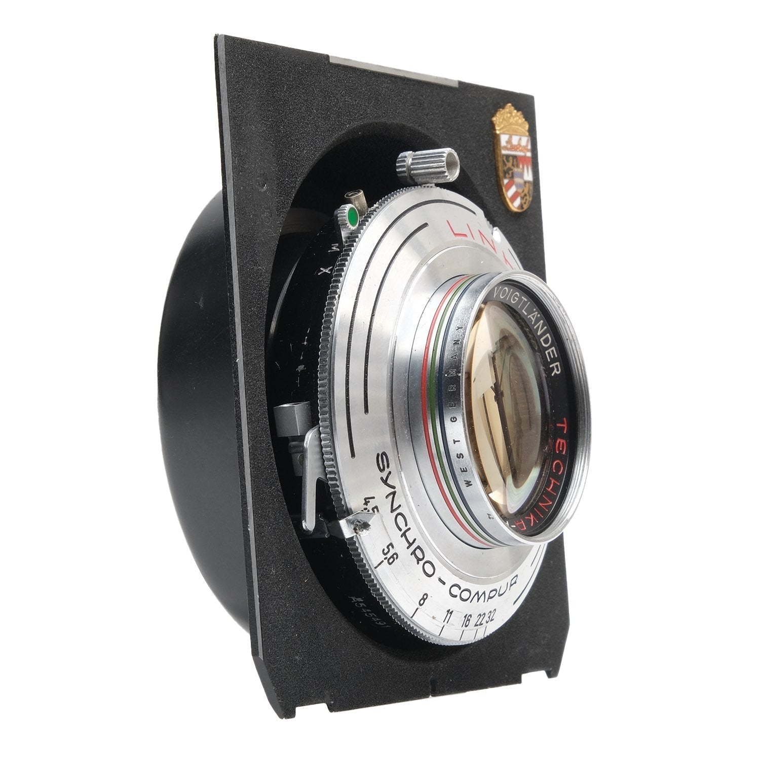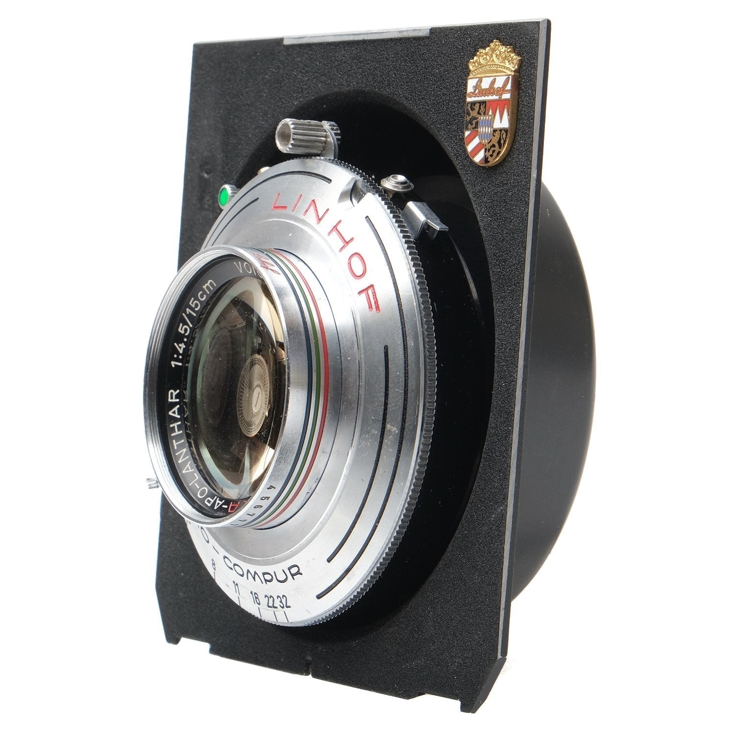 This Voigtlander 15cm f4.5 APO-Lanthar Lens for Linhof Technika, #4567779, is in good condition with some handling wear. I rate it cosmetically an (8+). It has coverage up to 4x5" and a 55-degree angle of view. The glass is clean and clear with no haze, marks, or fungus. There are a few faint specks of dust inside, but they do not affect image quality. The included Synchro-Compur shutter fires, although the shutter speed ring is a bit stiff. The shutter is accurate at all speeds. It includes a recessed Linhof lens board, a Linhof lens cam, and front & rear caps. Please refer to the photos for details.