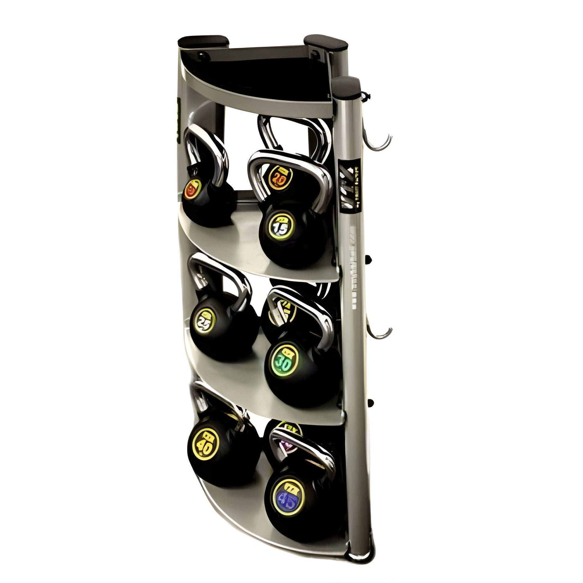 The VTX GKBR-3 Vertical Kettlebell & Accessory Rack is a stylish, space saving, small footprint rack that conveniently stores multiple kettlebells, bands, jump ropes and other accessory pieces. With its 4 shelves, 4 hooks and corner design, the VTX GKBR-3 is the perfect solution for facilities or homes with limited space.Notes: Kettlebells should only be stored on the bottom 3 shelves. The top, rubber lined shelf is not designed for storage of kettlebells. Kettlebells and bands not