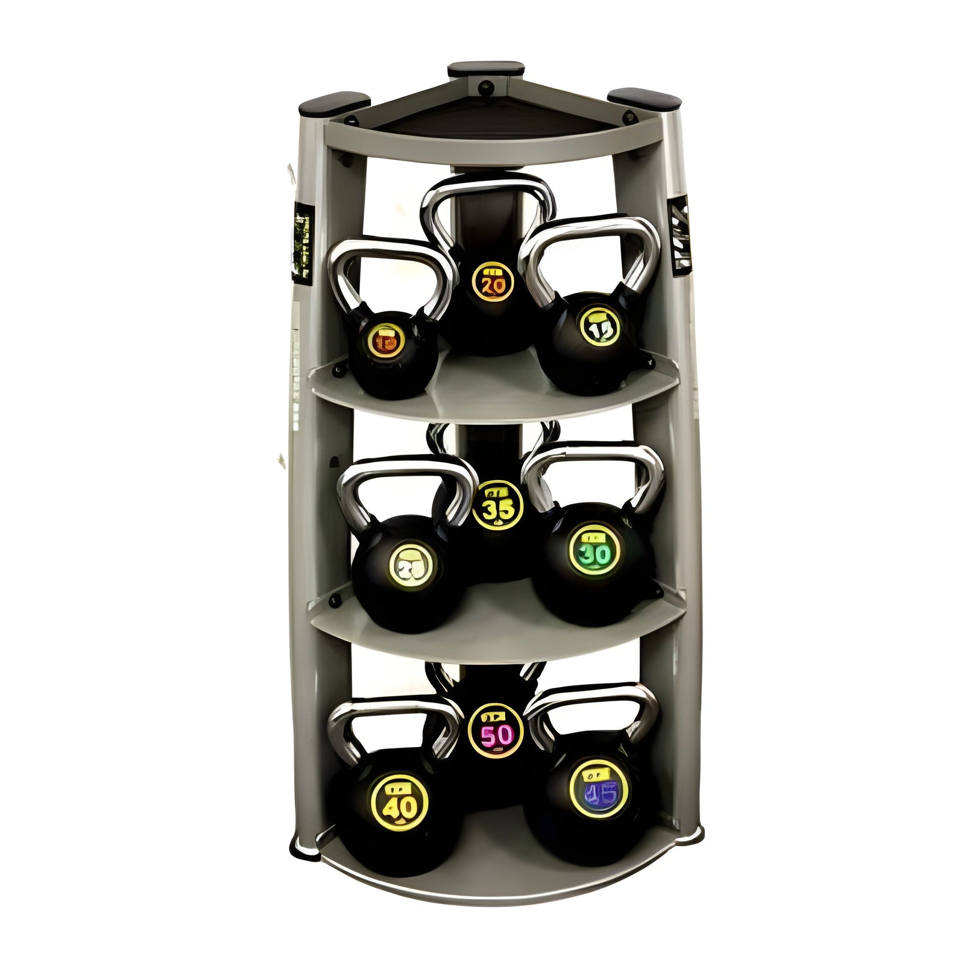 A: A space-saving, multi-tier rack designed to store kettlebells and small fitness accessories efficiently.