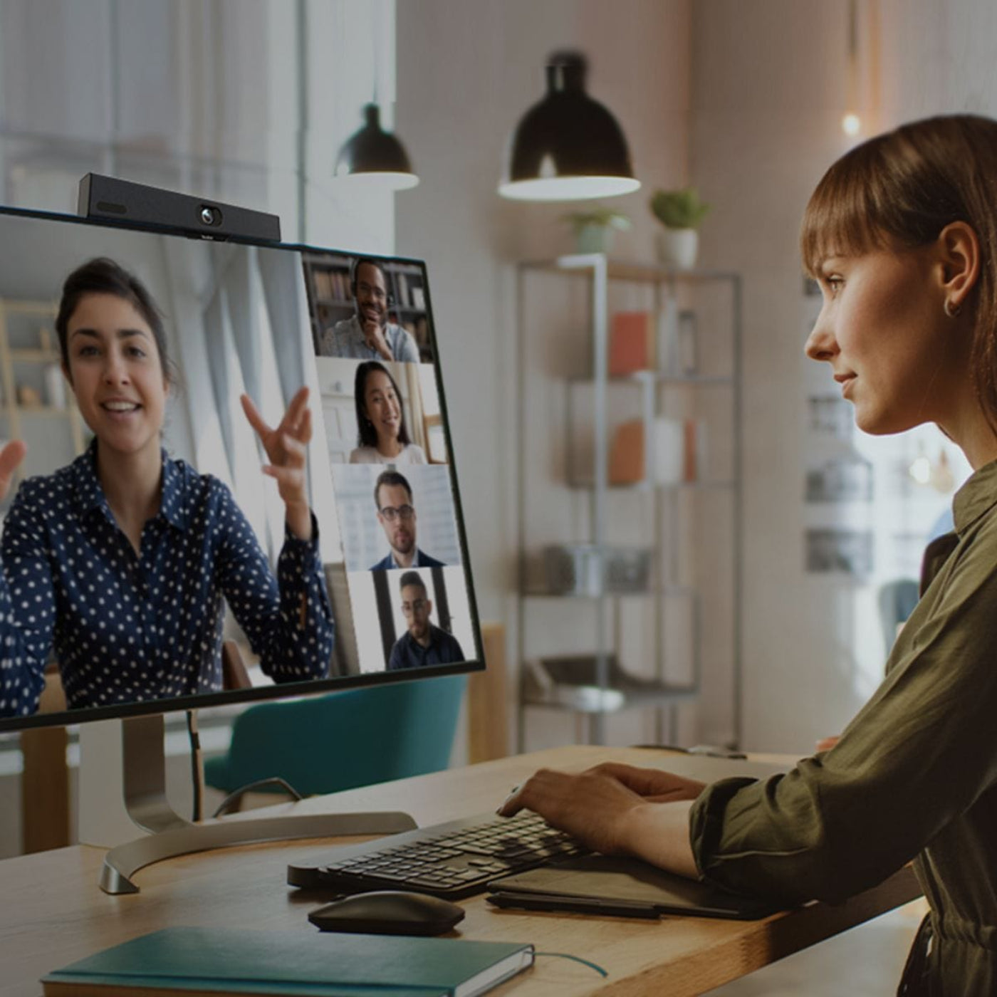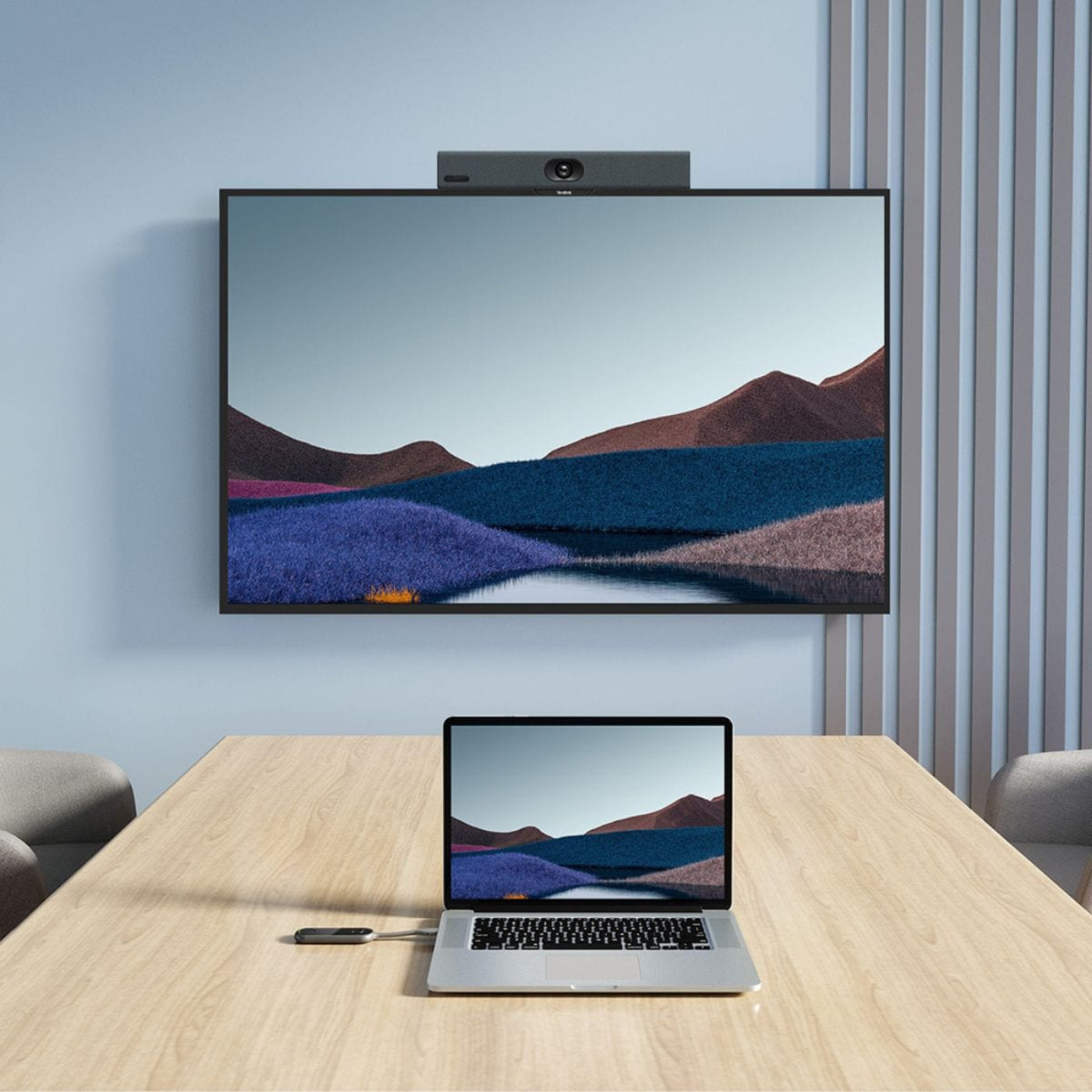A: Its compact size, wide-angle AI camera, and built-in audio make it perfect for huddle rooms and small offices, delivering high-quality video and sound without extra hardware.